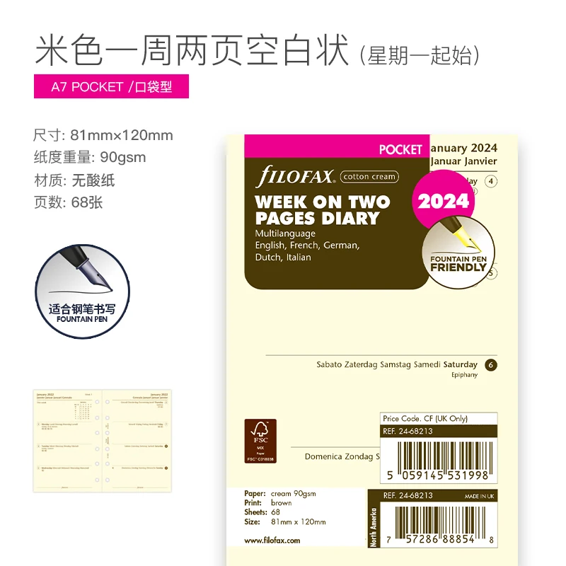 Filofax 2024 Weekly Planner Refill for Notebook, Two Pages Per